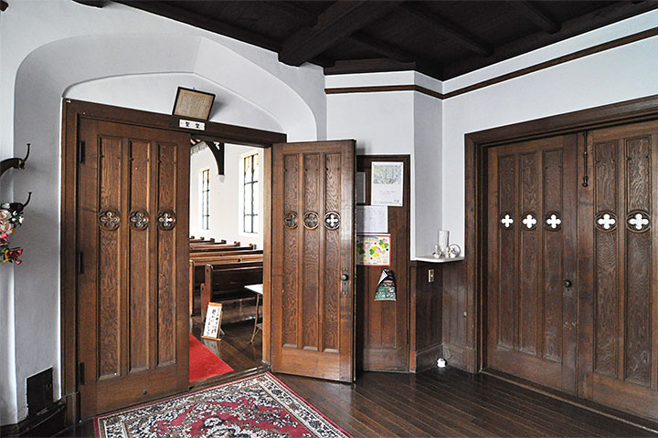 教会本体はRCで壁をつくり木トラスで架構して切妻屋根を載せたシンプルな形状で、三層の塔屋が付く。デザインはゴシック風。石造のような重厚さを出しつつ、コンクリートならではの彫塑的な表現も見られる。構造的に必要かどうかは分からないが、バットレスも付いている。内部に入ると、漆喰仕上げの壁に木トラスや木建具が映え、何とも魅力的だ。
