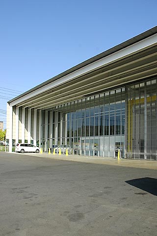 ![]() #1:開口部のサイズは幅45m、高さ9m。左半分がオフィスで右半分が整備工場。オフィスの中にはさらに入れ子の箱(会議室など)がある。整備工場のファサードは幅7.5高さ8mの3枚構成の引き戸(透明のポリカ)で、全開させることが可能。 |