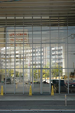 建築の構造も見た目通り。梁成600ミリの形鋼のラーメンで45mスパンを飛ばしている。平屋だし屋根も軽いからこれで大丈夫なのだろう。こうして生じた無柱空間を透明なガラスや引き戸で区切って使っている。梁同士の間隔は1.2mだから、室内で見上げれば梁だらけということになるが、これはこれで表現として悪くないと感じた。 さてさて、この種の建築を見ていつも思うのは日射と空調の処理。手塚夫妻は基本的に住宅作家だから居住性能という実用性と作家性の調和はできているだろうと思うけど、実際ここで働いてみるとどうなのか、かなり気になる。 |
