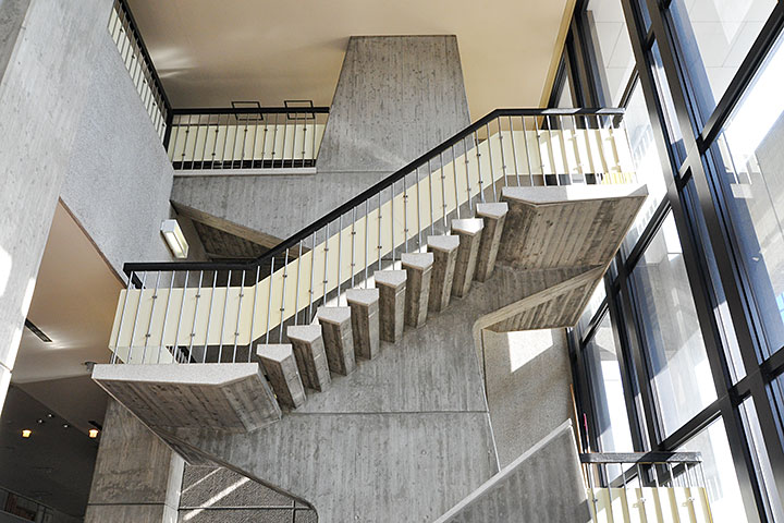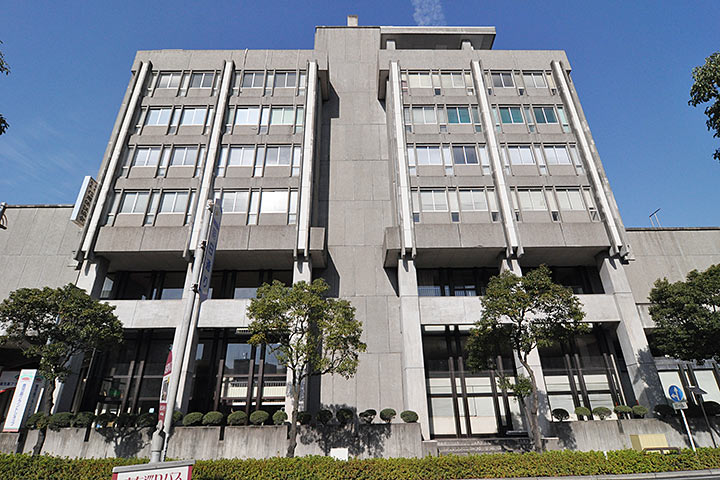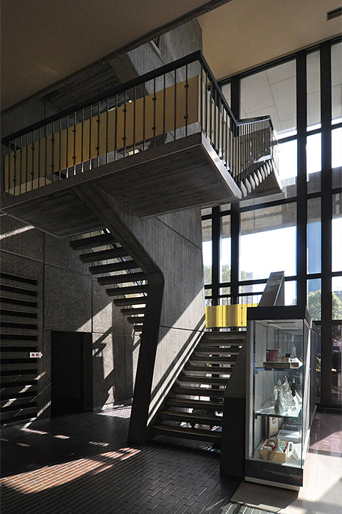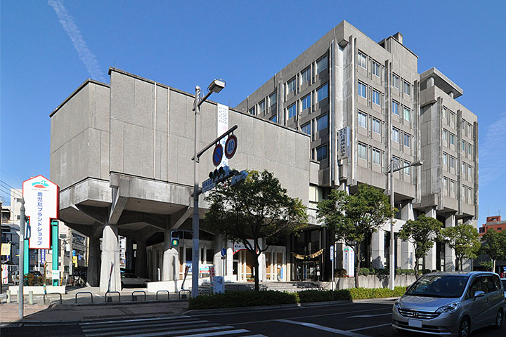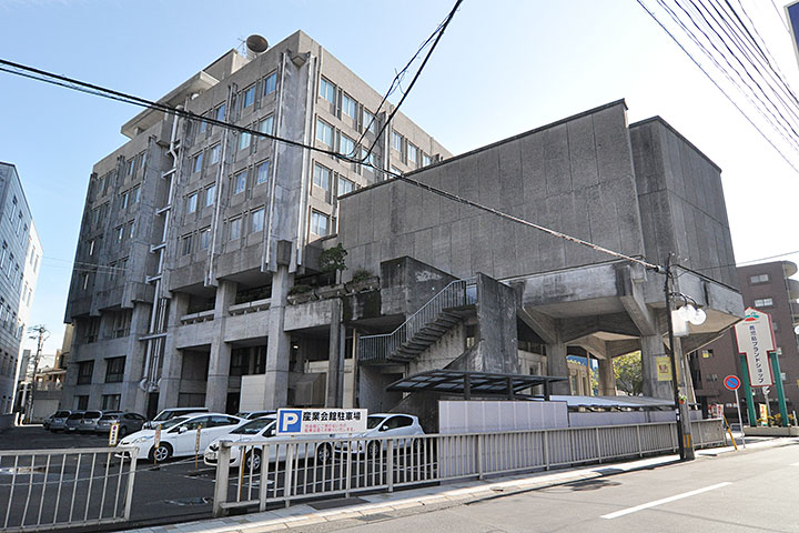 南日本銀行や山形屋などが並ぶ電車通りから一本入ったところに忽然と現れる大建築。基本的にはモダンなのだが、ピロティ周りをはじめとして、なんとも造形がゴツく、当時絶頂期だったメタボリズムの影響を感じさせる。一方、エントランスや屋外の片持ち階段は実にシャープで緊張感がある。