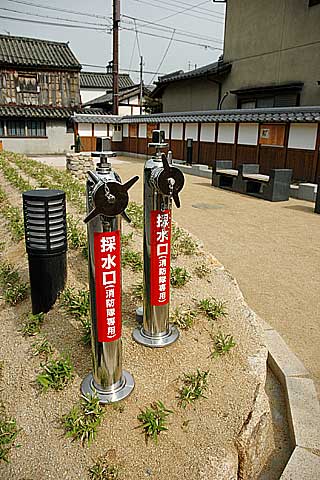 しかしながら、住民の高齢化とコミュニティ継承の問題、空き家の増加、建築物の維持管理費の負担、自動車や観光客とのつきあい方、災害への対応 … といった、活用と保存を両立させる際に避けて通れない諸問題が解決したわけではなく、今井も他の町と同様の悩みを抱えているようです。 ■歴史的景観を現代にどう調和させるか 今井を歩いていると随所に調和させるための工夫の跡を見ることができます。同時に、その難しさも再認識させられます。 ○伝建によるファサードコントロール 重伝建地区では建築活動全般に制限が加えられています。新築する場合、少なくともファサードについては厳しいコントロールがかけられます。(写真#10) ○停止線をタイルで表現 (写真#17) ○防災公園 伝建になるということは、地区の不燃化が今後とも達成されず、4m道路も整備されないことになります。そこで町内の数カ所に防火水槽や井戸を備えたポケットパークが整備されています。(写真#18, 19, 20, 21) ○自動車への対応 洋の東西を問わず歴史的街区で問題になるのは駐車場計画です。今井の場合、町中の数カ所に共同ガレージが置かれており、根本的な解決でないとはいえ、できる限りのことはやっているようです。 (写真#23, 24) |