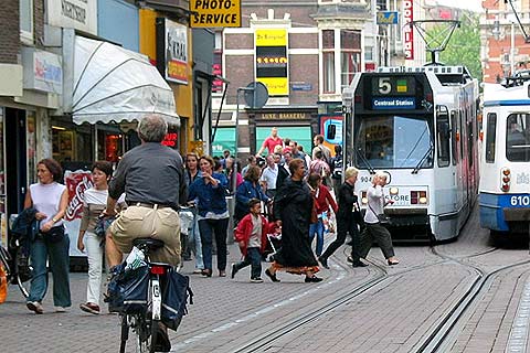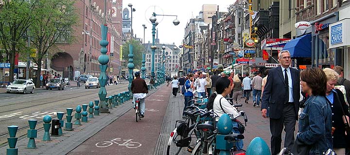 | 今回は、「建築マップ」からちょっと離れて純粋な都市ネタ、中活(中心市街地活性化)における有力なメニューの一つである「トランジットモール」を紹介します。事例は欧州を中心に世界中にありますが、ここでは手元に写真があるアムステルダムのライツェ通りを取り上げます。 | |||||||||||