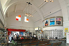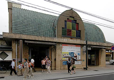 ヴォールト天井に瓦、ステンドグラス、アールデコっぽいパターンなど、実に奔放な意匠だ。デザインの善し悪しはともかく、相当の気合いを入れて設計したことはよく伝わってくる。おそらく先に開業した国鉄大社駅に対抗して「和風以外で何かすごいもの」を造ろうとしたのだろう。 一畑電車の経営は芳しくないが、この駅舎は地域の宝物として大切に使い続けられることを願いたい。 |