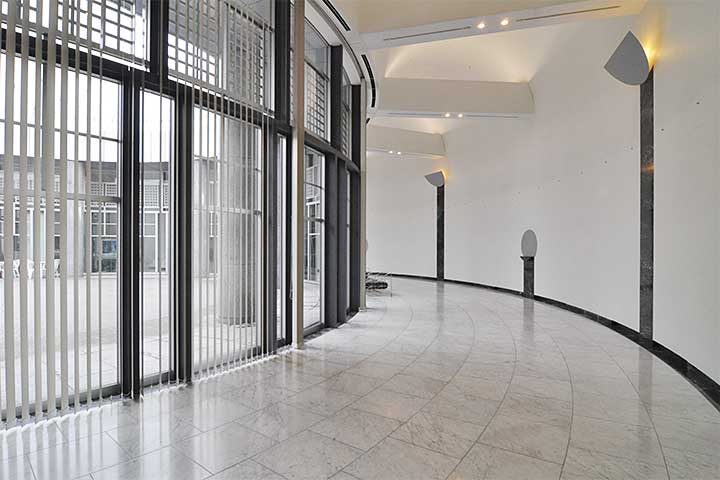 メタボリズムで建築界を騒がせた黒川だが、本作は1980年代らしくポストモダンの影響が各所にあらわれている。石垣っぽい基部の上に白壁の土蔵群のような造形が乗るあたりが最も分かりやすい。こういった抽象的な切妻屋根は一種のアイコンとして当時多用されていた。本作の場合は土蔵群の横に西欧由来の列柱が並ぶが、両者はそれほど違和感なく接合されている。エントランスには円形広場が配され、スリットで爆心地側を表現している。スリットの延長線上にはムーアの「The Arch」という門型の作品が置かれる。この軸線の表現は丹下のピースセンターに呼応させたのかもしれない。